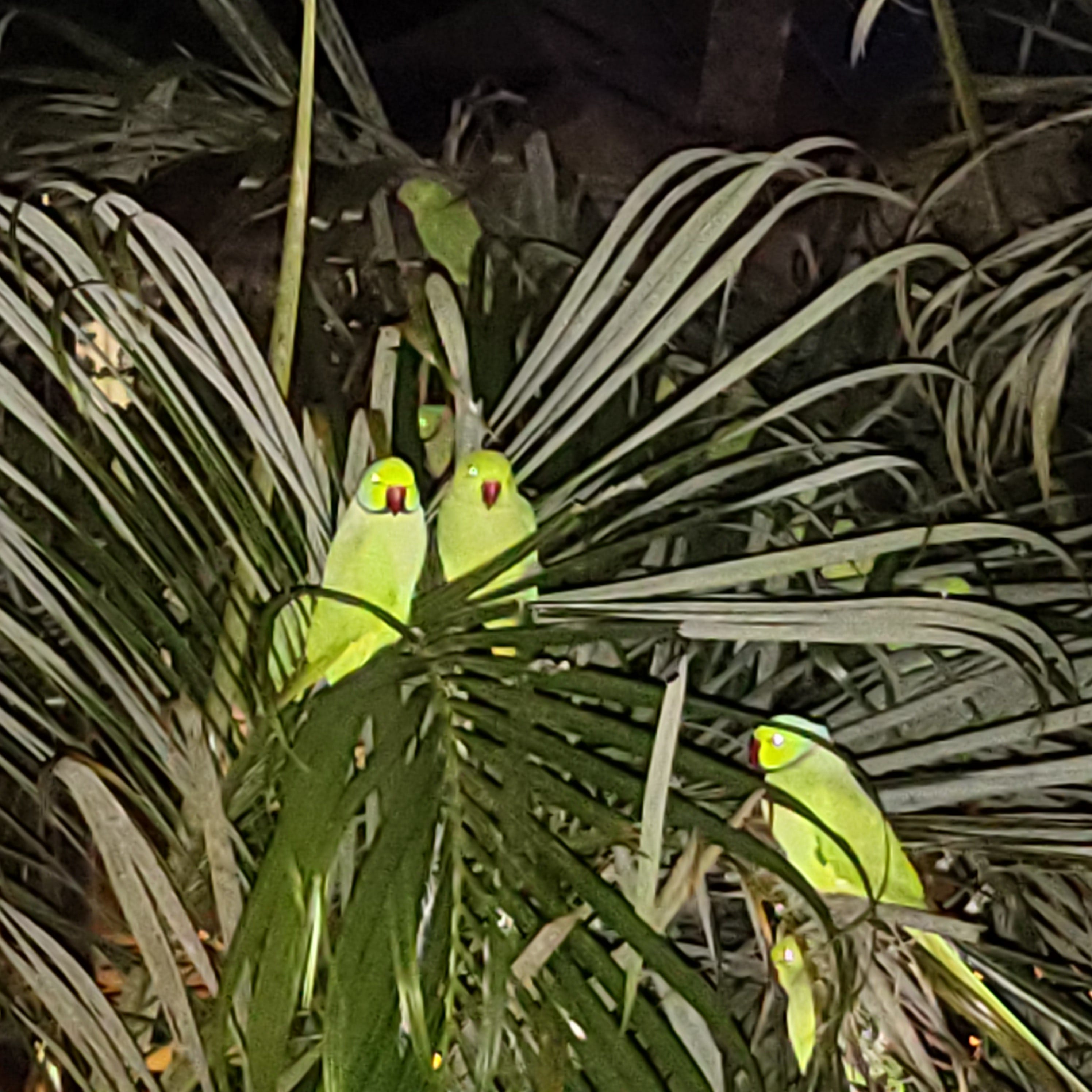 An awe-inspiring yet easy-to-attain bird experience on Kauai is the daily commute of the Rose-ringed Parakeet. There I was, minding my own business, enjoying the sunset at a popular restaurant on Poipu Beach, getting ussies with my group and the other hundred tourists, when a few of the most striking lime-green parakeets soared in, landing in the palm trees near the patio. CUTE! I snapped a few photos. But then, a few more arrived. Then a few dozen, then a chattering hoard of hundreds of parakeets, all squawking so loudly as they settled into the fronds above that you could hardly hear the ukulele music thrumming from the restaurant speakers. I was dumbstruck. More than a a few fellow diners actually looked terrified, as if re-living a scene from The Birds, but the version where people are sunburned and flushed with rum.