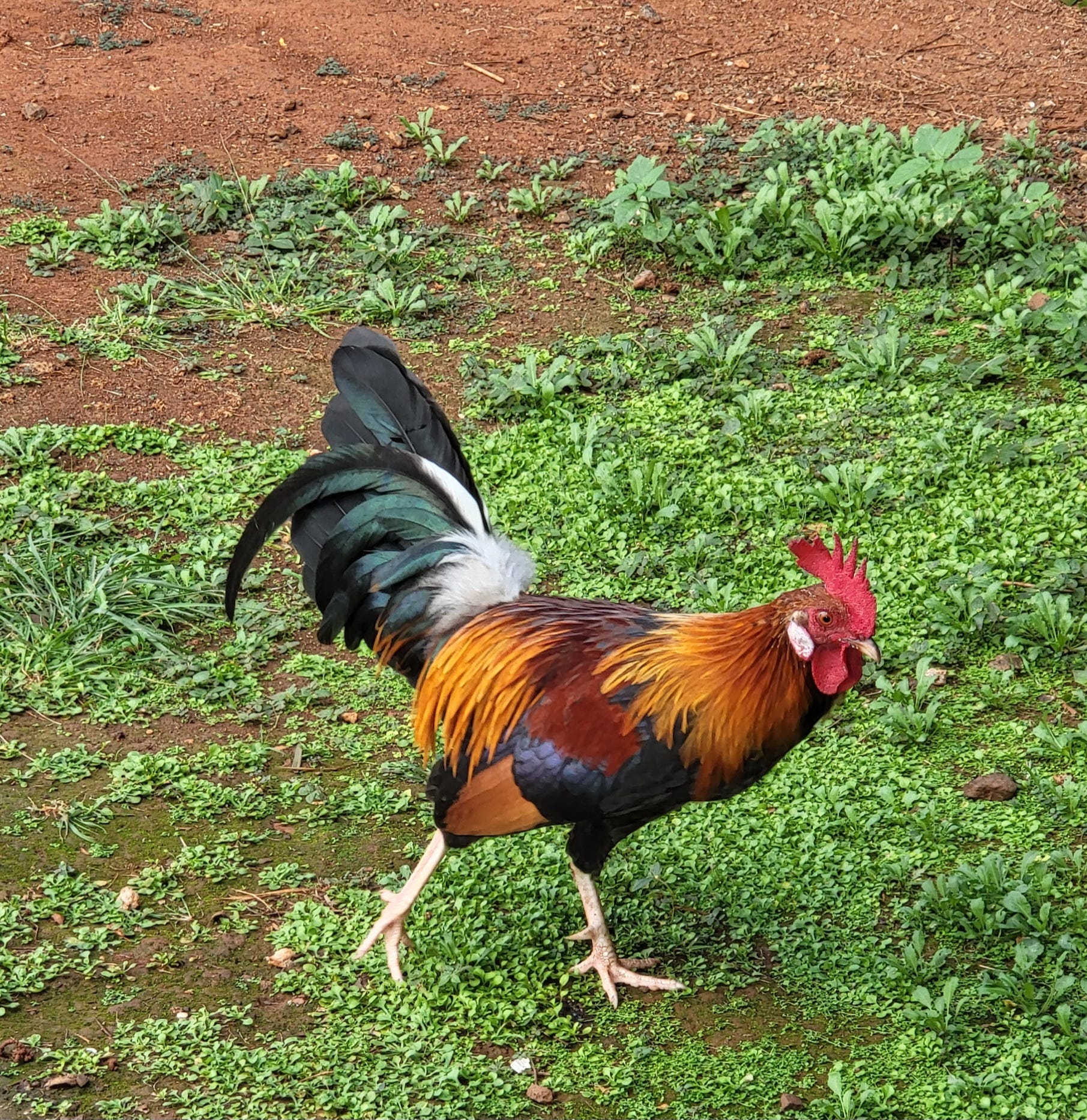 If you inquire with the concierge about the birds, she will shrug and send you on your way with a smile that makes you feel like a dumb haole. Which, obviously I am, a white lady traipsing around one of earth’s most beautiful places and complaining about the lack of sleep. Yet, the once-native (as of 1500 years ago, brought by the Polynesians), now feral birds are ruffling enough local feathers that some plans to control them are in the works. Here are some sources on the history and perspectives on Hawaii’s “chicken problem.”